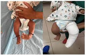 Correction of the deformity is in the order of CAVE, i.e. the cavus is corrected first followed by the adductus, etc. At this point, there is often a residual equinus deformity which requires percutaneous Achilles tendon release which is per formed in our hospital under a short general anaesthetic.